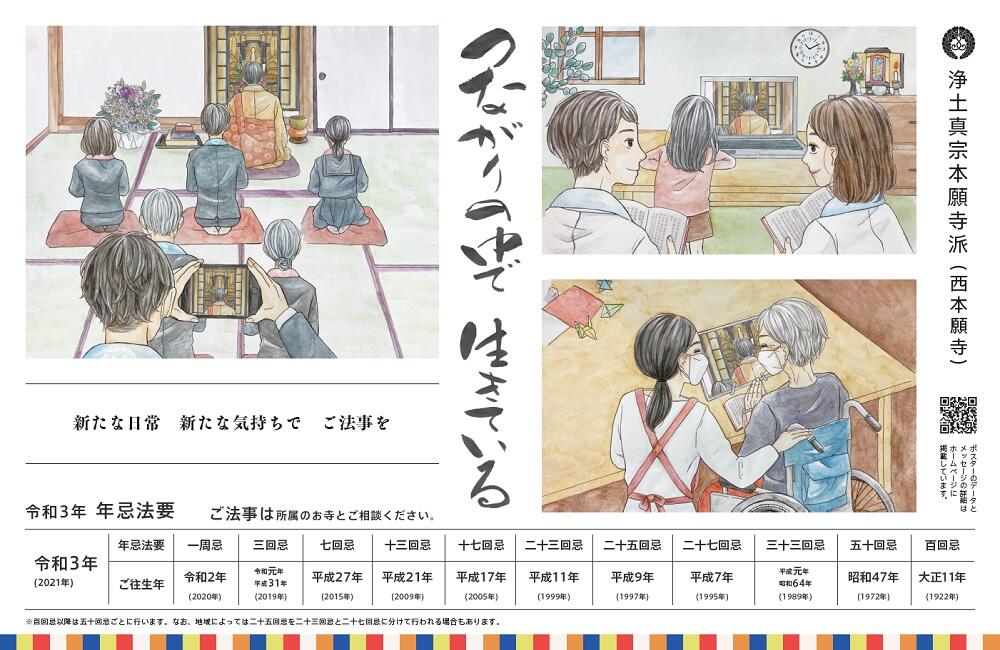 また、コロナ禍において、可能な限り仏縁にあっていただくため、法事の一例として「リモート法事」をテーマにした仏事奨励ポスターを作成いたしましたので、法事・法要を行う際のガイドラインと併せてご活用ください。
