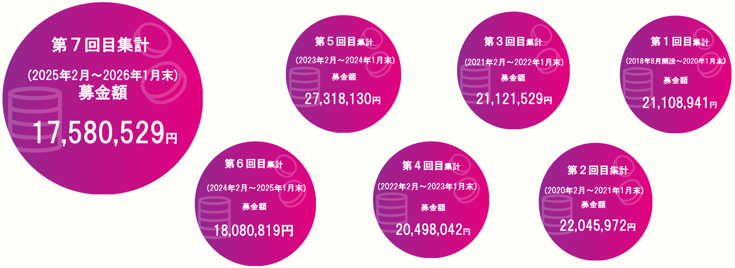 2018(平成30)年から取り組んでいる笑顔のために募金は、2020年1月に1回目、2021年1月に2回目、2022年1月に3回目、2023年1月に4回目、2024年1月に5回目、2025 年1月に6回目の集計を行いました。現在7回目の集計【2026年1月31日】に向けて取り組んでいます。