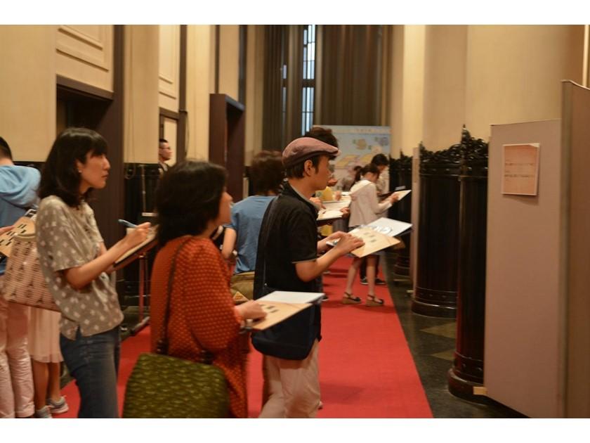 本堂に大型スクリーンを設置し、そこに「伊東忠太博士からの謎」と題された映像でスタート。参加者は築地本願寺内に散りばめられた謎を一問一問解き進みます。知恵を絞り、頭を抱えながらゴールに向かう姿はどの顔もとても真剣。見事、ゴールにたどり着くことができた参加者は約7割。残りの3割は未だにゴールできずに時空空間をさまよっているかもしれませんね。