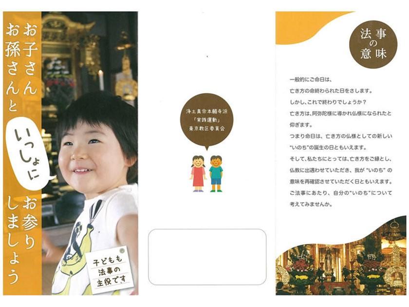 このキャンペーンは、キッズサンガの理念にも通じるもので、東京教区ではリーフレット「子どもも法事の主役です」を作成し、教区内寺院に配布しました。